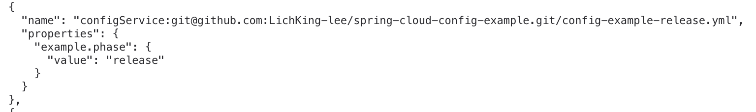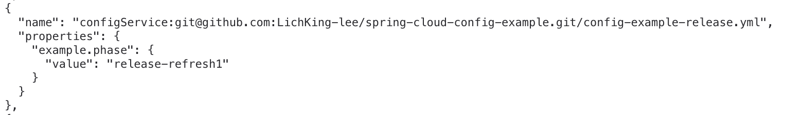 이렇게 수정해서 push 했다. 이 과정에서 유의할점은 config server 는 건드리지않아야한다. 간단히 로컬에서 구동중이라고 아무생각없이 서버를 리스타트하거나 그러지말자. 서버는 그대로 있는 상태에서 설정만 바꿔서 push 하고, config server 를 확인해본다.
