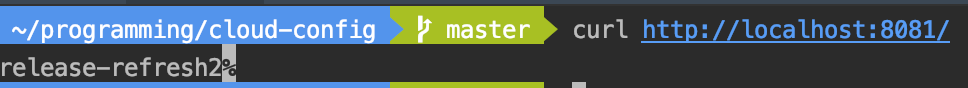 refresh 를 추가해준다. 그런데 이 설정을 적용하려면 어찌됐든 config client 를 재시작해줘야하고, 그러면 위 설정과 관계없이 어차피 config server 를 다시 요청하기때문에 이미 설정이 변경되게된다. 설정을 한번 더 바꿔서 push 해주자. 그리고 아래처럼 config client 를 호출하자.